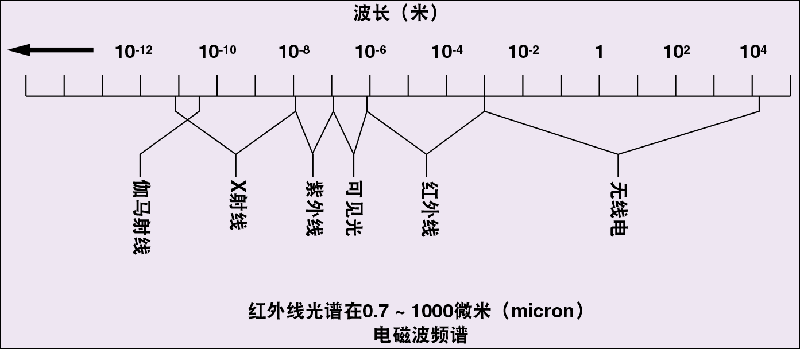 如前所述,紅外線能量是由所有溫度高于0?K的材料發(fā)射的。紅外線輻射是電磁波頻譜的一部分,其頻率在可見光與無線電波之間。光譜中紅外線部分的波長在0.7微米~1000微米(micron)之間。圖1。在此波段內,只有波長在0.7微米~20微米的頻率用于實際的日常溫度測量。這是因為目前工業(yè)中使用的紅外線探測器靈敏度不足,無法檢測到20微米以外波長上的極少量能量。