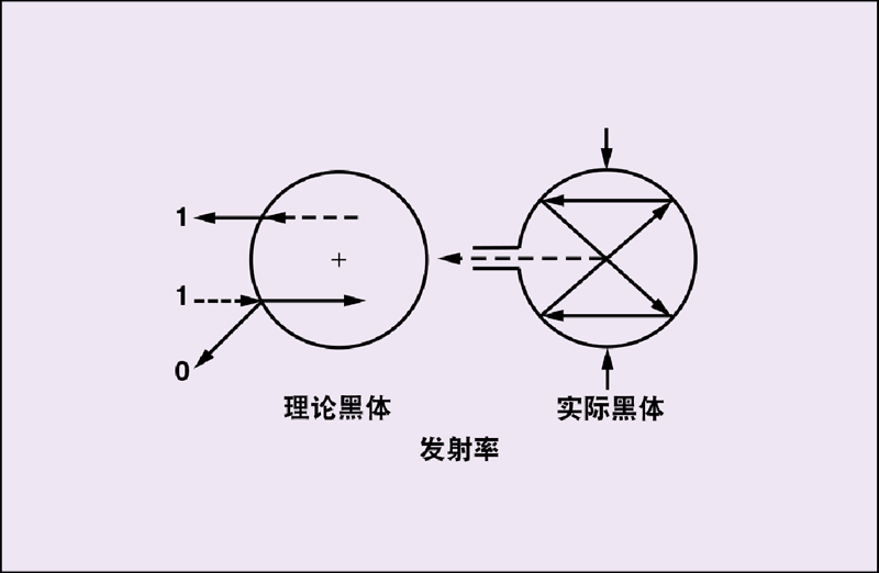 既不反射也不透射任何紅外線能量的材料稱為黑體,我們知道自然界中不存在黑體。然而,在進行理論計算時,給真正黑體賦予值1.0。在現實中,最接近黑體發(fā)射率1.0的近似值可以在圖3中所示的、帶有小管狀入口并且紅外線無法透過的球形空腔中得到。這種球體內表面的發(fā)射率為0.998。