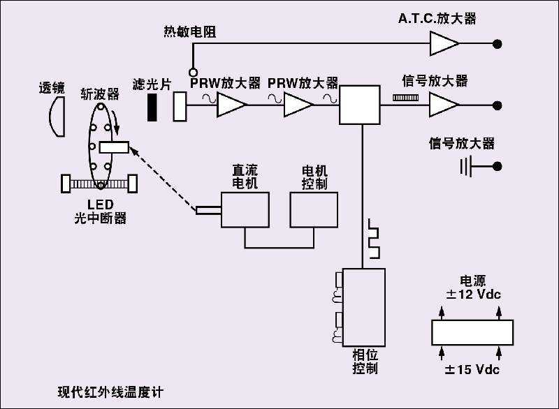 現代IRT以這一概念為基礎,但在技術方面更加復雜,從而拓寬了其應用范圍。主要差別在于使用了多種多樣的探測器;紅外線信號的選擇性濾光;探測器輸出信號的線性化和放大;提供:4~20mA、0~10Vdc等標準的最終輸出信號。圖5為典型的現代IRT的示意圖。