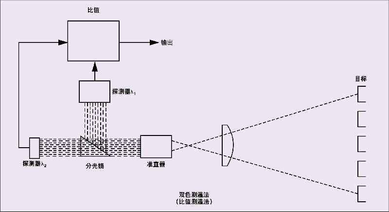 雙色測溫法由于發(fā)射率在用紅外線溫度計提供精確的溫度數據方面起著如此重要的作用,不斷地嘗試設計能夠獨立于該變量進行測量的傳感器也就不足為奇了。這些設計中,最負盛名并且應用最為廣泛的就是雙色溫度計。該技術與到此為止介紹的紅外線溫度計沒有什么不同,但它測量的是材料在不同波長放射的紅外線能量的比值,而不是測量在一個波長或波段內放射的絕對能量。在此上下文中使用詞組"顏色"有點兒過時,但是這種用法卻仍未被取代。它源于將可見顏色與溫度相關聯的古老做法,因此有了"色溫"的說法。